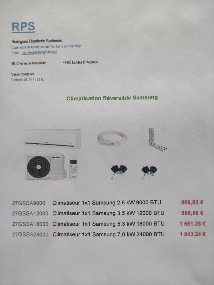 Chez RPS - Rodrigues Plomberie Systemes, nous sommes fiers de proposer des solutions de climatisation à prix discount à Marmande. Forts de notre expertise en matériel de plomberie et de chauffage, nous nous engageons à fournir des produits de qualité supérieure à des prix compétitifs. Basés à Agen, nous desservons également les régions environnantes pour répondre à tous vos besoins en matière de climatisation et de chauffage.